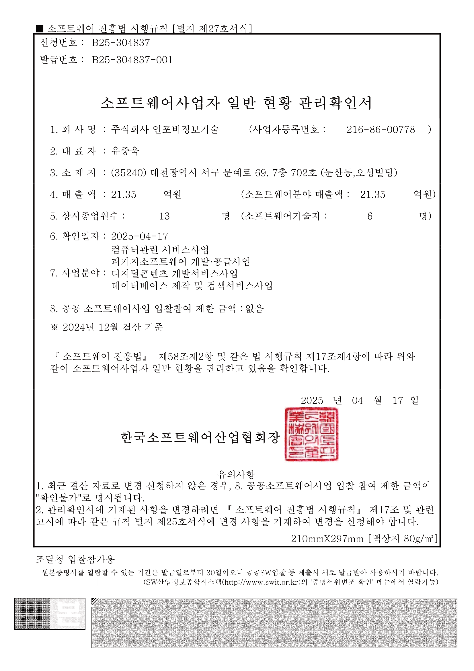 | 소프트웨어사업자 일반 현황 관리확인서 | 한국소프트웨어산업협회 | B25-304837-001 | 2025년 04월 17일 |
